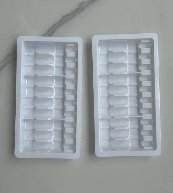 Индивидуальная настройка лотка для 10 бутылок по 2 мл с двумя доступными размерами: 14,3*7,3 см или 15,4*8,3 см. Наши оптовые пластиковые лотки из ПВХ предназначены для внутренних лотков вакуумного формования для игл для воды объемом 1–10 мл для медицинских целей.